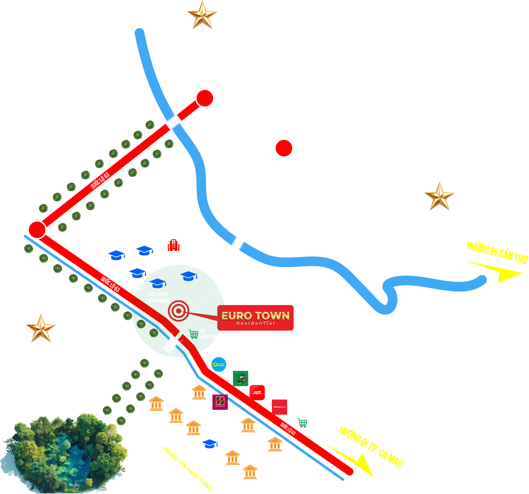 Euro Town sở hữu vị trí vàng ngay trung tâm hành chính huyện U Minh Thượng, mặt tiền Quốc lộ 63 – trục giao thông huyết mạch kết nối các khu vực trọng điểm của tỉnh Kiên Giang với Hậu Giang và Cà Mau. Từ dự án, cư dân dễ dàng tiếp cận hàng loạt tiện ích và cơ quan hành chính chỉ trong vài phút di chuyển: